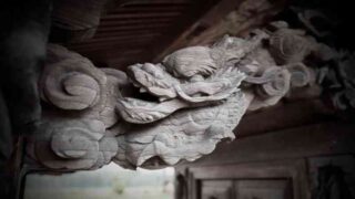 鯉の滝登りみたいですが、元々ここにあった物ではない様な感じ。でも離れた所から見ると身舎の汚れと相まって山水画の様にも見えます。修復した人は画才があるのかも知れません。