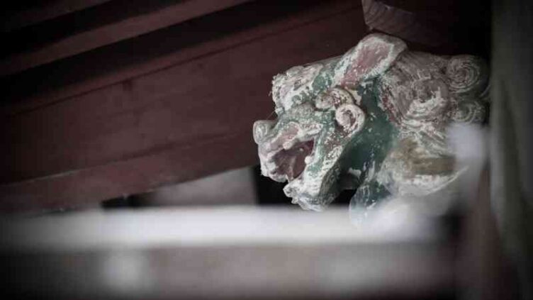 神社仏閣 彫工 立河芳司藤原伴綱の親子獅子 [羽黒神社] 栃木県 平成九年に建てられた拝殿の向拝中備には「栃本村 彫工 立河芳司藤原伴◯」と銘がありますが、これは明治二年に拝殿が建てられた時かそれ以前の時の中備だと思われます。 2026.03.19 栃木県神社仏閣