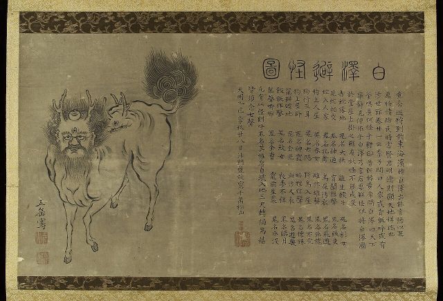 Wikipediaには 「白沢は 中国に伝わる瑞獣の一種。人間の言葉を解し 万物の知識に精通するとされる。その姿を描いた図画は魔除け(厄除け)として用いられる」 とあります。